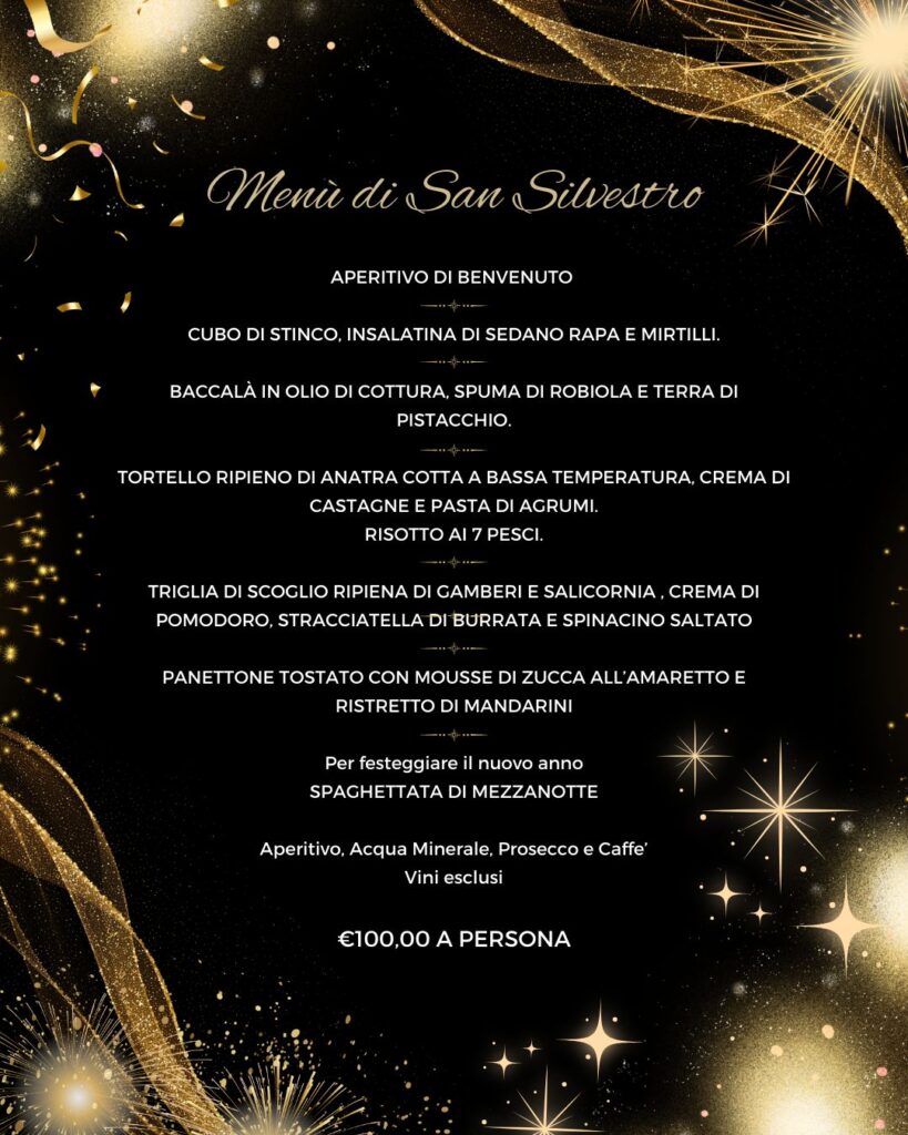 Un fantastico menù ideato e realizzato dai nostri chef. Musica con DJ durante la serata. E poi dopo la mezzanotte… Spaghettata!